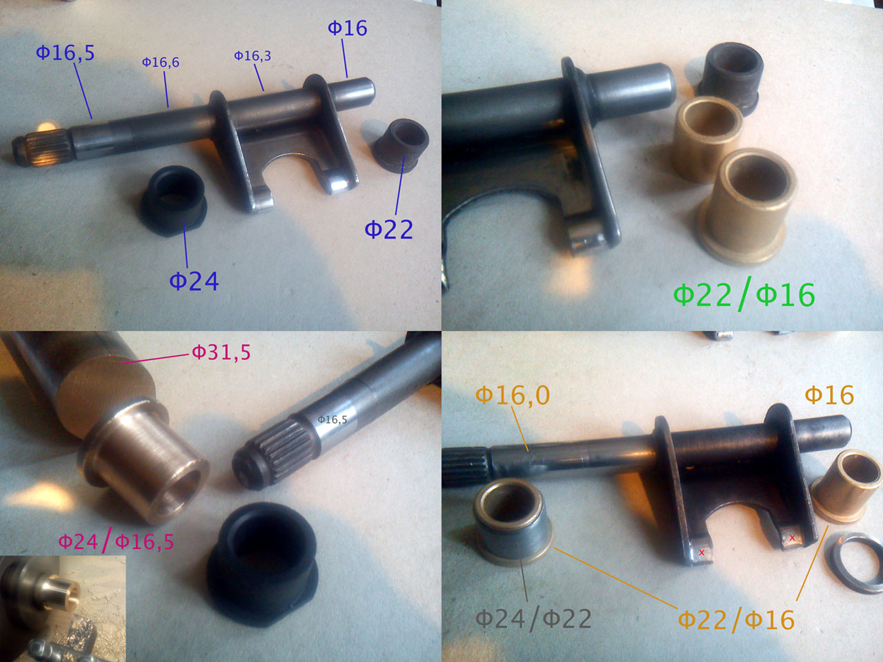 Słabym punktem układu sprzęgła są żałosne plastikowe tulejki, wycierają się szybko. Oczywistym pomysłem jest tutaj zastąpienie ich metalowymi, np. z brązu. Nie wiadomo po co (aby utrudnić) ktoś wymyślił kilka średnic na tak prostym elemencie (mogła być jedna, 16 mm, ułamki nie potrzebne). Fotka pokazuje wymiary. Tulejkę dolną (fi. 22/16) można bez problemu dokupić (standardowa część maszynowa), z kołnierzem lub bez, stal, żeliwo, brąz, łożyska igiełkowe (nie polecane, pożyją krócej od plastiku w takich warunkach).