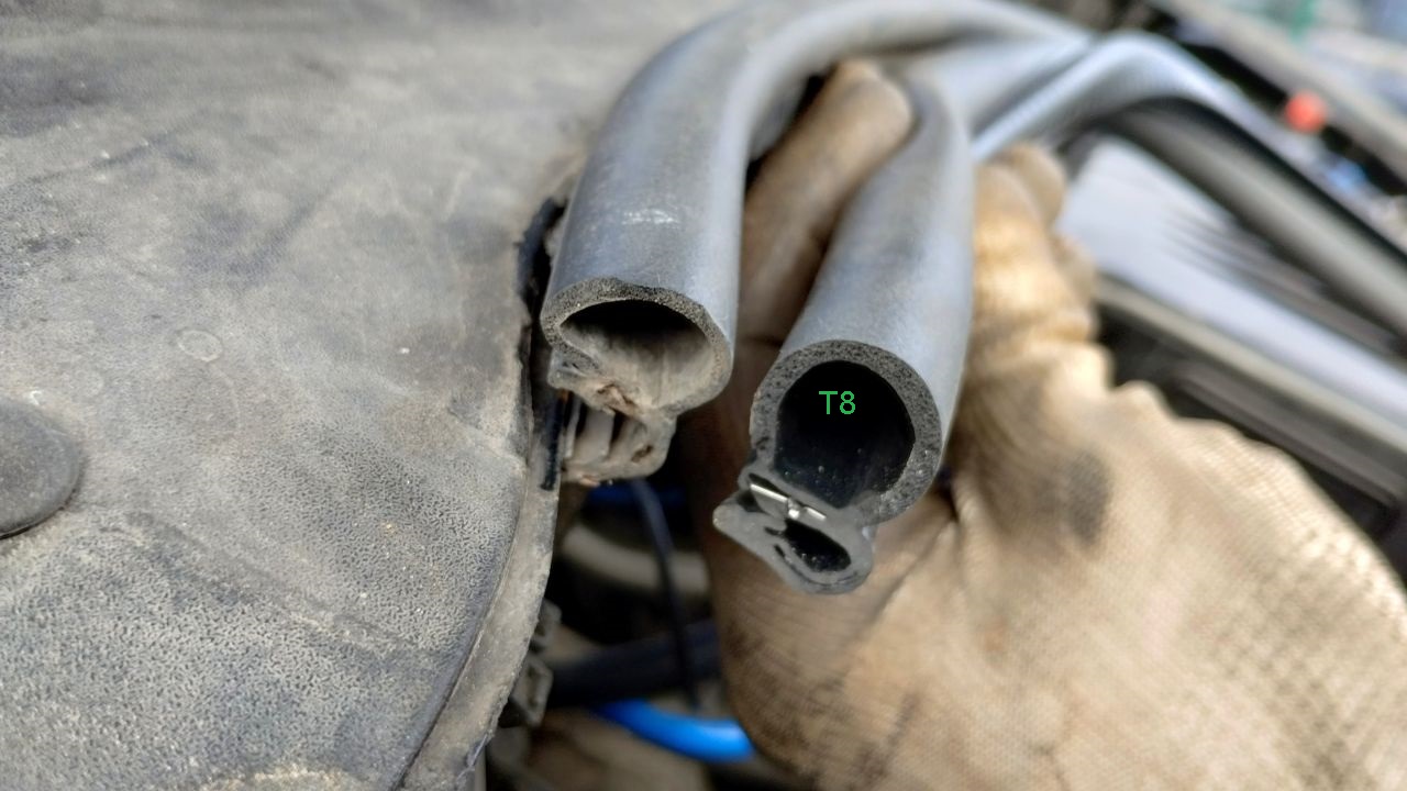 Nowa uszczelka wchodzi bardzo ciężko, rozważyć jakieś smarowanie przy montażu. Starych pianek/gąbek NIE wyrzucamy w całości, mają zostać połówki idące w błotniki (ten odcinek przeważnie się nie psuje, rozwalają się przy grodzi/podszybiu).