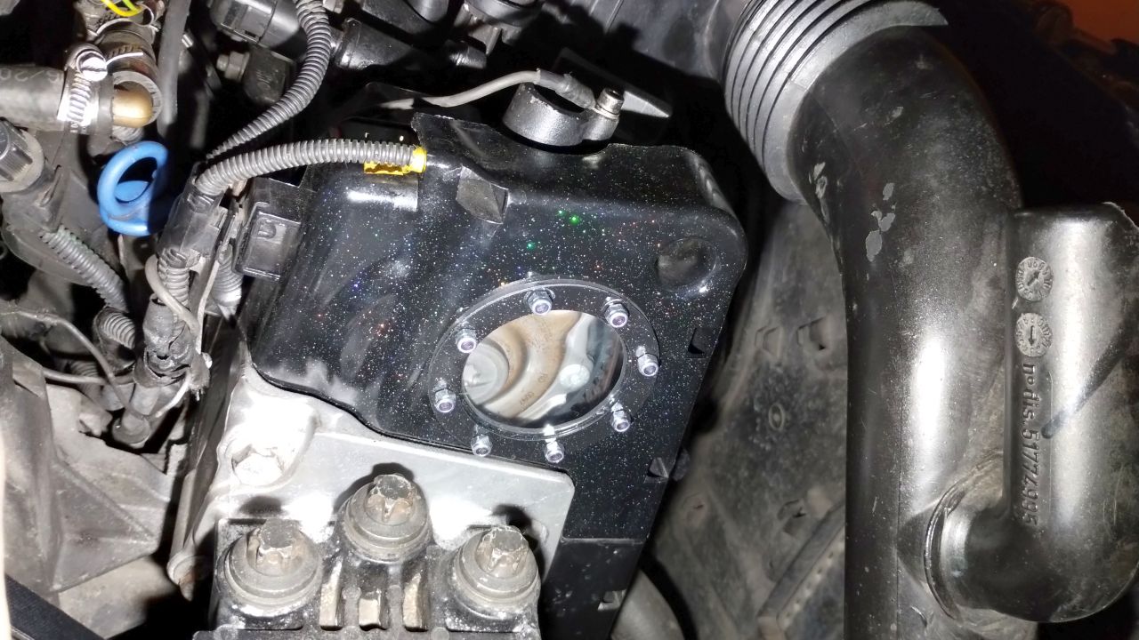 Z bajerów (z nudów raczej), można też iść (zboczyć) w tę stronę. Coś wizualnie poprawić (funkcję praktyczną to też pełni, diagnostyczną, można sprawdzić, czy pasek nie spada z koła i w którą stronę, niestety nie widać przez takie okienko czy pęka - tu by można w 1,4 8V wykorzystać puste miejsce w pokrywie zaworów, tam gdzie 1,2 8V bez zmiennych faz mają czujnik wałka, zrobić tu małe okienko). W planach jest też podświetlenie tego (jak świecące obudowy komputerów PC). W dolnej obudowie rozrządu też by się taki wziernik przydał (np. do podglądu wycieków). Na wykończenie polecam lakier bezbarwny z brokatem (na zdjęciach nic specjalnego, na żywo super).