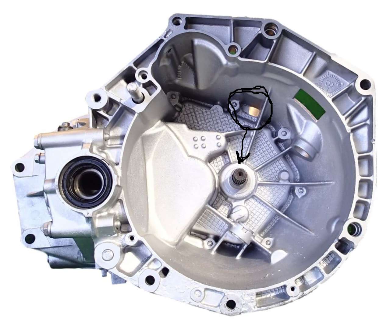 1. Tuż na łączeniu dzwona skrzyni i obudowy właściwej ("tylnej"), obok wybieraka, od góry skrzyni, jest nieregularny otwór. Widok od środka.