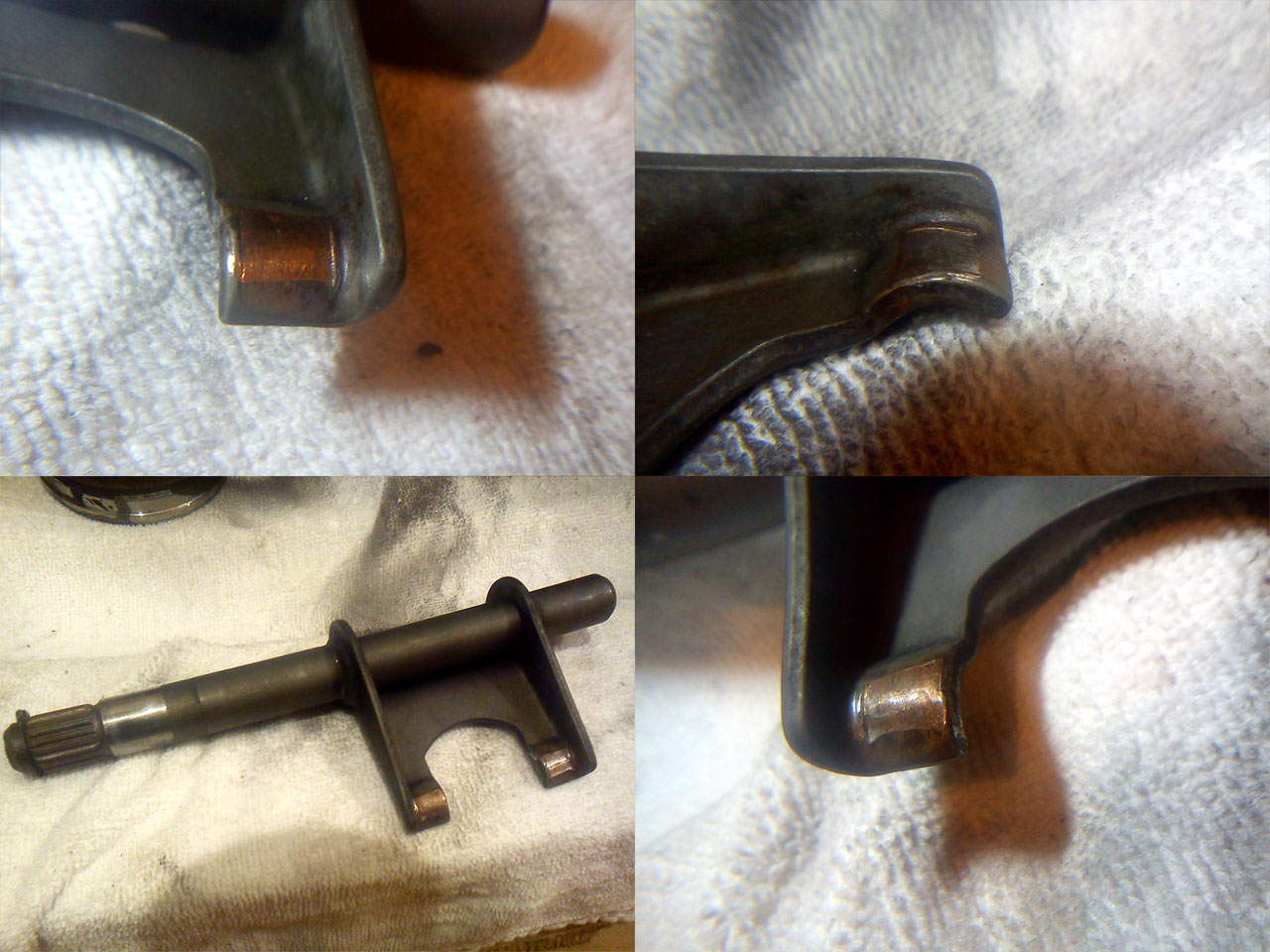 Aby modyfikacja/usprawnienie miały sens, cała łapa musi być mocniejsza i wytrzymać dłużej (aby okładziny sprzęgła się zużyły, a nie słoneczko łamało, czy łożysko rozpadało od przekrzywionej łapy - taki jest cel tych eksperymentów i na tym polega wada modelu Grande/EVO). "Palce" trzeba napawać czymś mocniejszym (stal narzędziowa, czy szybkotnąca HSS - materiał jak na wiertła). Tak, to moje brzydkie spawy (przy obróbce była porowatość - tutaj bez znaczenia, ale wady wyszły).