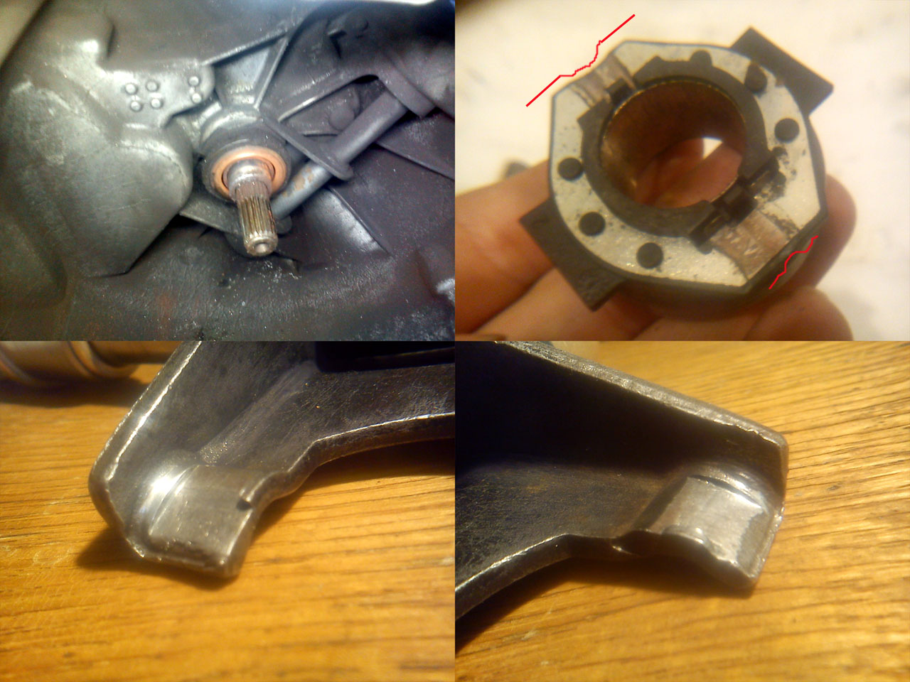 Co do słabych łap/widelców i tulejek, oto przykład, lekkie zużycie (do wymiany, ale by jeszcze pojeździło). Niestety 90% "zawodowców" takie coś pomija, zostawiają przy wymianie sprzęgła (co skraca żywot nowego zestawu)! Jak dajecie auto na wymianę sprzęgła, to męczyć, dopilnować mechanika, aby wymienił łapę+tulejki.