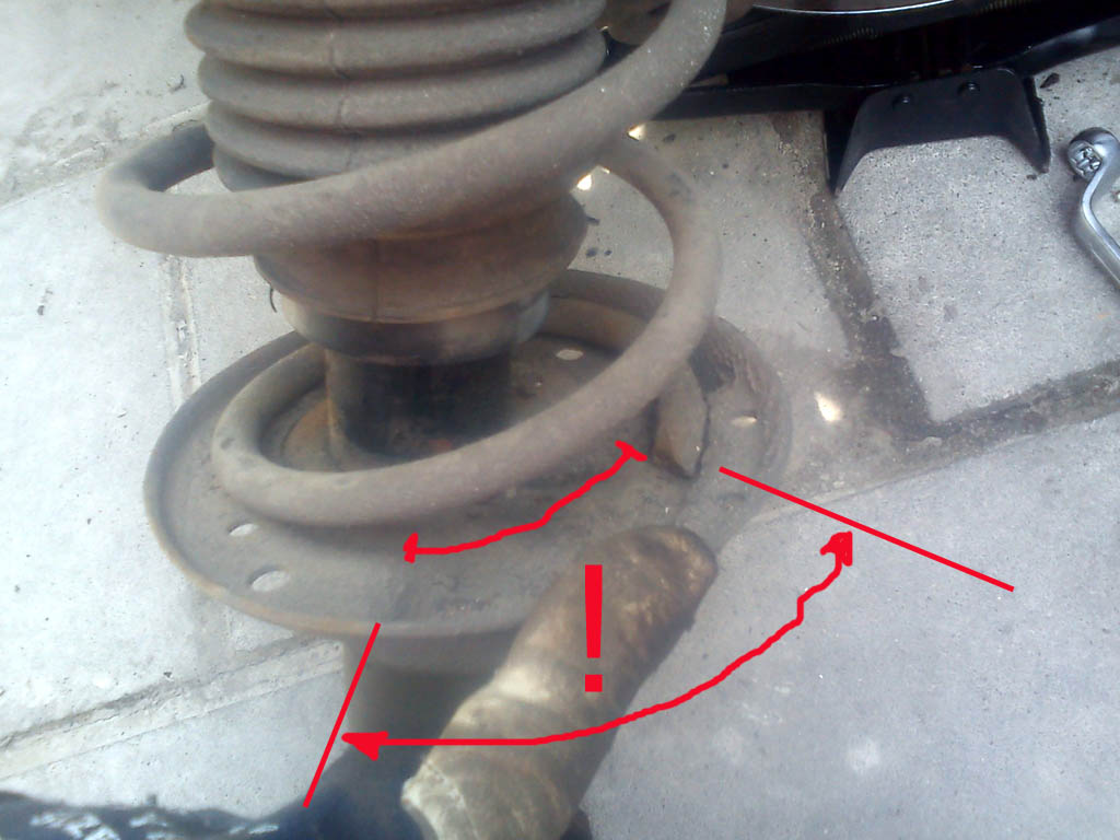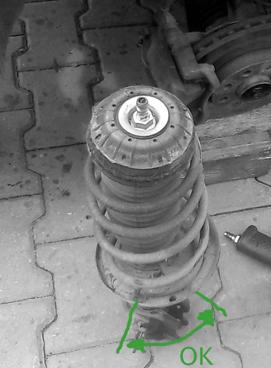 4. Kolumnę trzyma nakrętka od góry (talerzyk na kielichu) i dwie śruby przy zwrotnicy. Wcześniej odpinamy od amora łącznik stabilizatora, odczepiamy przewód ABS i wężyk od hamulca. Tyle. Fotka archiwalna (od razu sugeruje co będzie dalej źle).