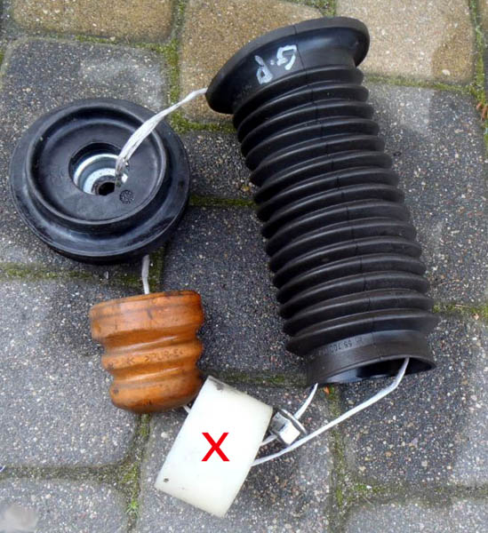 8. Przykładowa fotka z Allegro. Łożysko/poduszka, odbój, osłona. Ktoś nadgorliwie i niepotrzebnie zerwał biały plastik z amora (to jest część "integralna" amortyzatora, tego się nie zdejmuje, nie handluje tym - chociaż na poprzedniej fotce ja też to zbiłem). Internet to świetna pomoc przy naprawach, ale uważać (oferty mogą błędnie coś sugerować - co stanowi "komplet", a co nie, jaka jest pozycja i kolejność montażu i tak dalej).