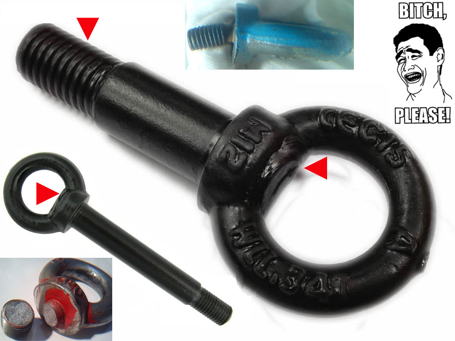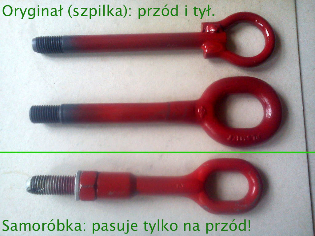 Takie samoróbki się jak najbardziej wykonuje na warsztatach i one wytrzymują, ale "wolno" tak robić nieoficjalnie i tylko na użytek własny! NIE NA SPRZEDAŻ. Za TO sprzedawcom należy się but na ryj. 3. Szybciej i taniej było zdobyć oryginalne, kute uszko od starszych Fiatów (P1, Palio, Siena). Gwint jest ten sam, ale wewnętrzny zamiast zewnętrznego. Plus, długość za mała (to dobrze). Załącznik: