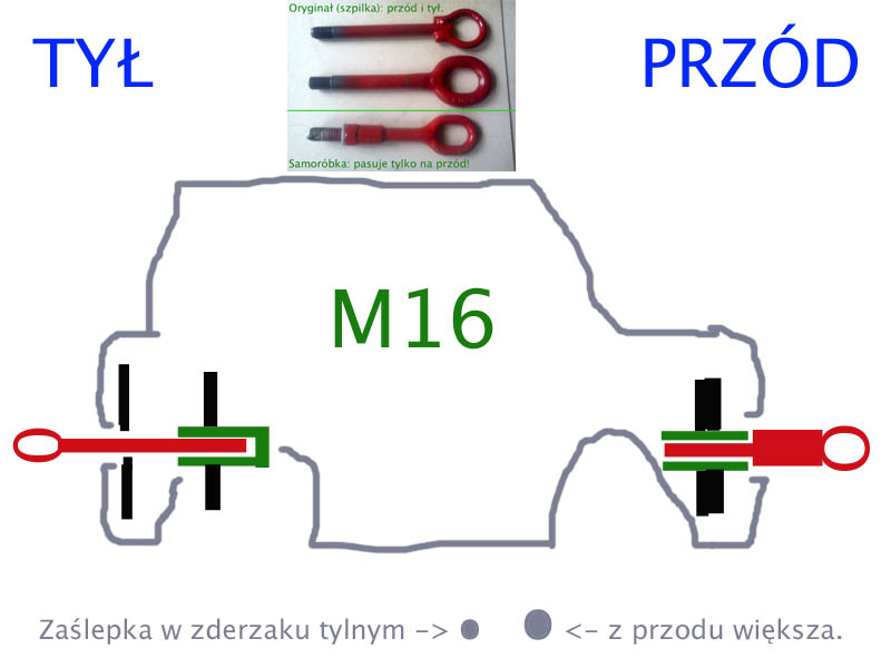 Fajnie, bo ten dodatkowy otwór po drodze stanowi "wzmocnienie", podparcie szpilki, aby się nie wyginała (ale z przodu takiej pomocy ona nie ma, stąd wiele używanych uszu jest pogięta - uważać jak kupujecie, absolutnie nie brać krzywych). Rozwiązaniem (przedłużającym życie tych szpilek) jest posiadanie 2 różnych sztuk: przerobiona jak w temacie (na przód) oraz oryginalna szpilka (tylko na tył). Najważniejsze. Jak otwory są latami nie używane, to nic się nie wkręci. Raz na kilka lat otwory trzeba przeczyścić gwintownikiem (i zakonserwować "na tłusto"). Musi być przedłużany albo zwykły + przedłużka. Jak było wcześniej podane: zwykły gwint M16 (jedyna pozytywna rzecz, dobrze, że nie wymyślali z lewymi gwintami). Załącznik: