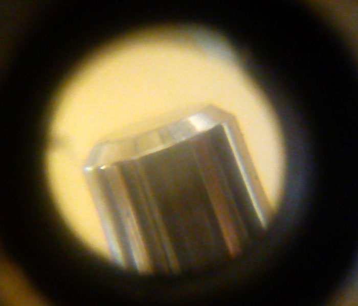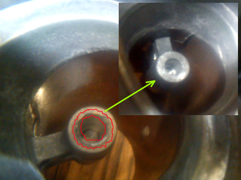 Wsad powinien się opierać na "pinie" (tłoczysku, popychaczu) w otworku korpusu (poprzednia fotka). Jednocześnie zapewniając nacisk talerzyka (aby na zimno termostat na prawdę był zamknięty). Tutaj niezgodność wynosiła tylko 0,3-0,4 mm, czyli w praktyce wystarczyło tylko liznąć fazkę na końcu pina. Zależnie od egzemplarza (i firmy/modelu) termostatu i wkładu, może być więcej do obróbki.