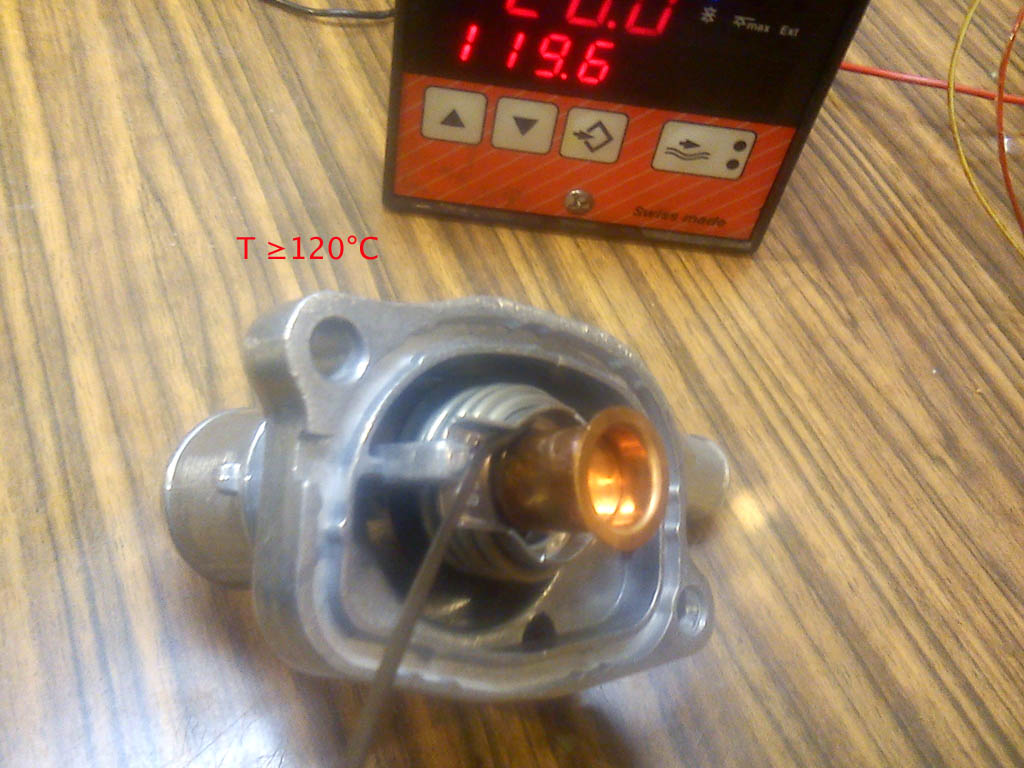 Test opalarką. Trochę za mocno (na pewno było przekroczone 120 stopni, odczyt zaniżony). Ale wytrzymał, nic nie wybuchło, nie pękło. Przy tradycyjnym gotowaniu w wodzie nie widać początku otwarcia (w okolicach 88 stopni, woda już bulgocze), ta metoda była dobra w przeszłości, jak termostaty miały niższe wartości o kilka stopni (robi różnicę).