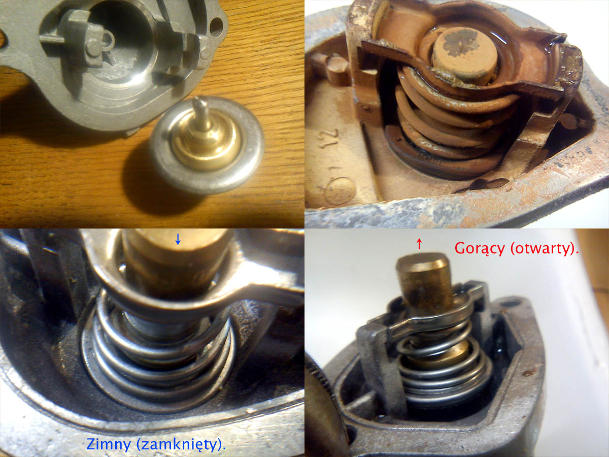 Z lewej na górze tani termostat dla starych FIRE, metal o metal uszczelnia, goły talerzyk. Obok stary termostat z Punto 1, na talerzyku jest nałożona guma (albo zwulkanizowana, przyklejona do niego). Na dole inny styl też ze starych czasów, talerzyk metalowy, ale ma ukrytą uszczelkę (niewidoczna), "o-ring". Przy okazji pokazane jak wygląda zamknięty i otwarty termostat.