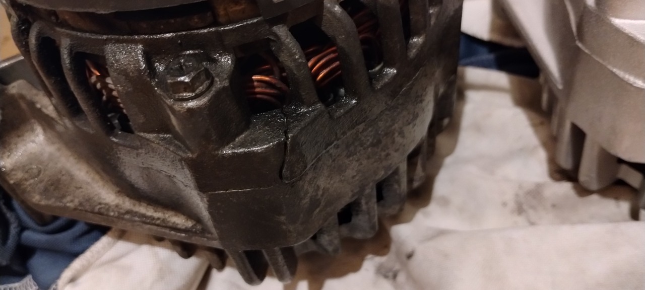 nieprawidłowe odpływy wody z podszybia były, lało na alternator kiedyś) narobiła zniszczeń w strukturze odlewów. Pęknięta pokrywka w dotyku jest jak papierek, wafelek, skorupka od jajka. Słabe, lekkie, kruche. Naprawa tego (lub wymiana) plus ewentualnie mostek (też korozja pogryzła), regulator, łożyska, może sprawić, że taka naprawa będzie nieopłacalna. Jedynie jako hobby, czy w ramach ćwiczeń.