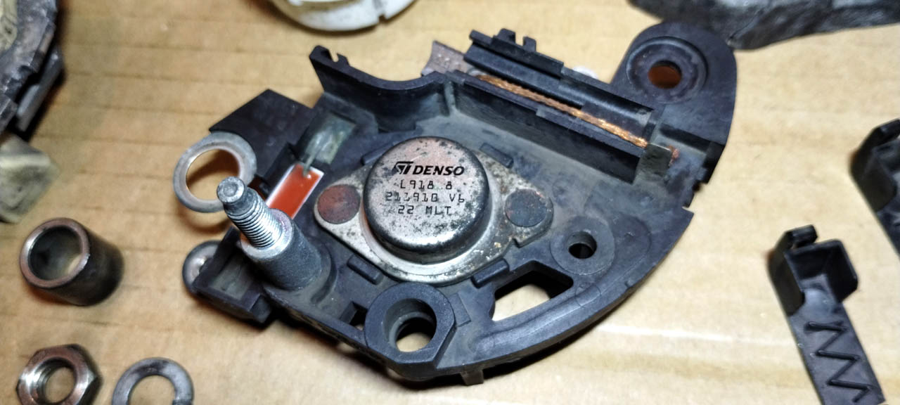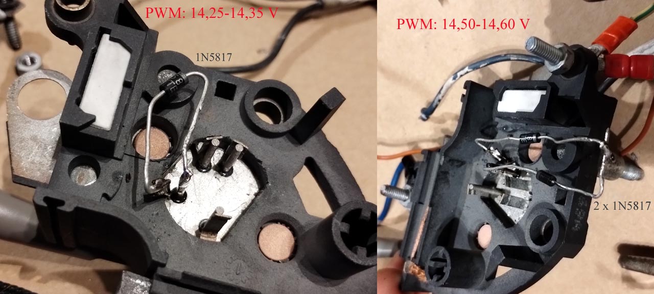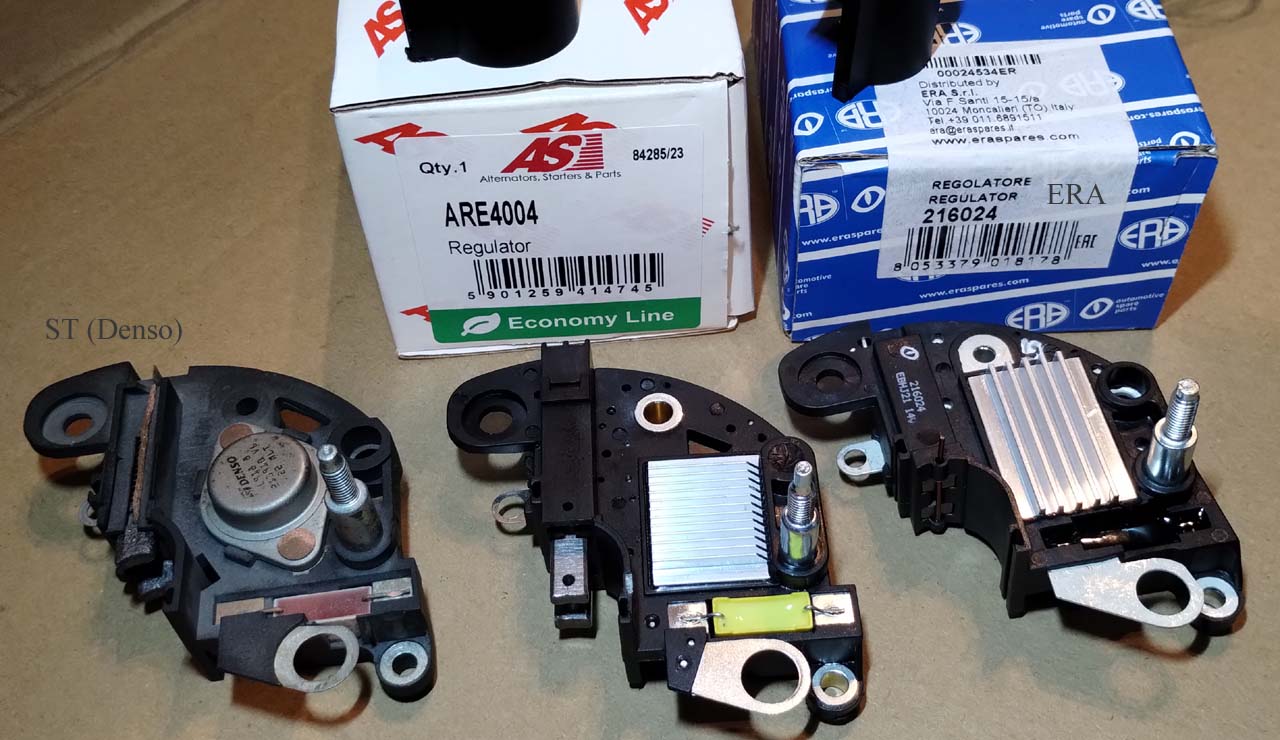 Stary regulator działa najlepiej, pełna kultura, oprócz usterki/wady, czyli obniżonego napięcia (14,0-14,1 V testowany poza samochodem, czyli pod obciążeniem byłoby jeszcze gorzej - i było, stąd wymiana alternatora). Napięcie można podbić wstawiając diodę Schottky-ego (lub dwie) w nóżkę zasilającą układ scalony (co zaniża mu zasilanie, więc ładuje wyżej). Nie testowane na samochodzie (jak trwałe to by było, ale w domu na stole działa). Oczywiście w praktyce trzeba by to wlutować niżej w zagłębieniu i zalać żywicą (tutaj była oryginalnie, ale się pokruszyła). Nie wiadomo co na to linia "ph" (phase sensing), może też wymagać przeróbki (bo np. nie może być wyżej od zasilania "chipa" ST). Także NIE polecam modyfikacji na razie.