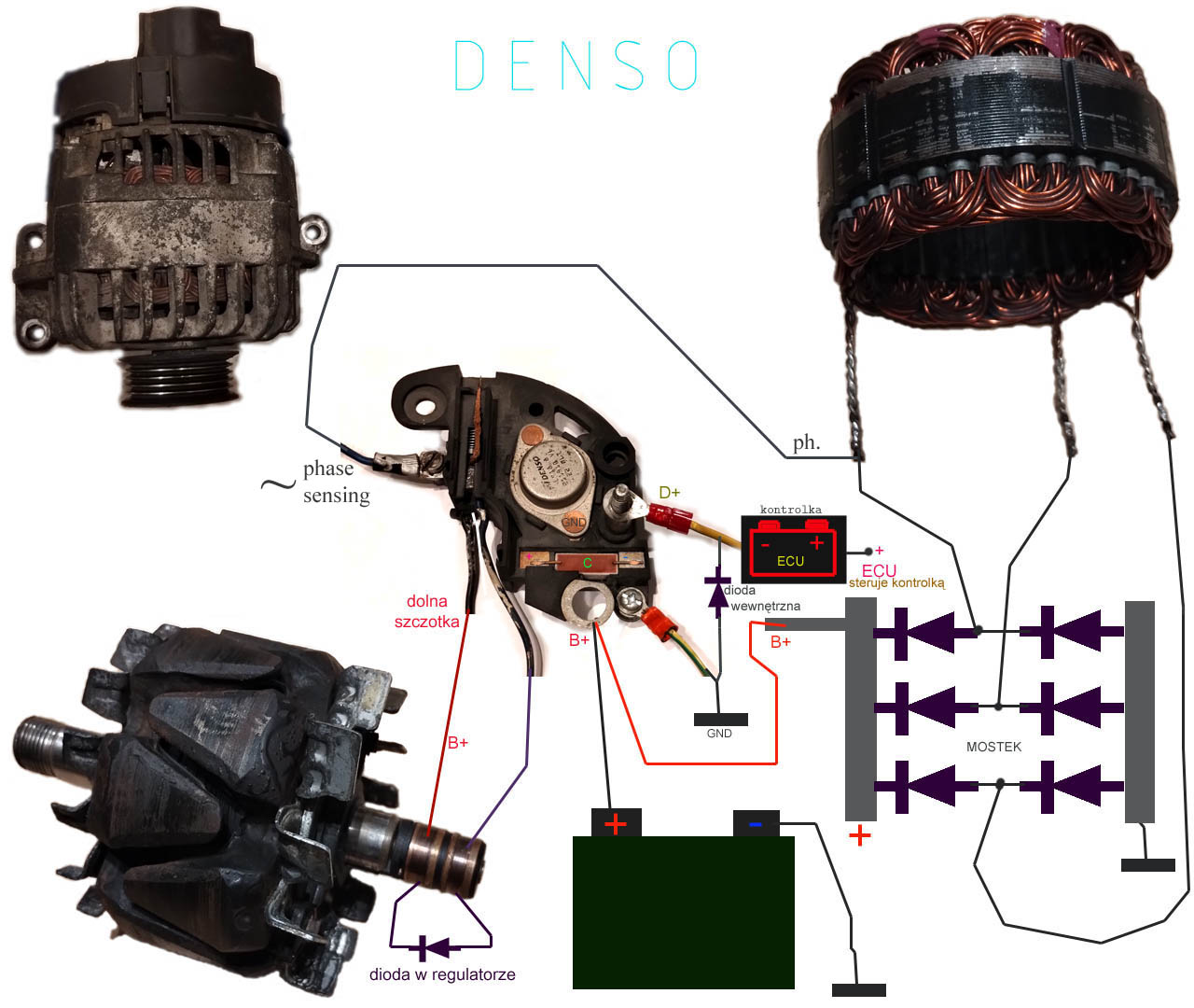 Schemat alternatora. Do obudzenia wystarczy mały prąd, dioda LED z rezystorkiem na D+. Albo niewielki sygnał przemienny podany jako z uzwojenia ("phase sensing"). Na Elektrodzie.pl widziałem tematy, gdzie "testowali" regulatory, a w ogólnie nie przyłączali tam nic (a to zaburza pracę regulatora). Alternatory innych firm (M-M, FAST, Bosch) oraz regulatory mogą mieć nieco inaczej rozwiązane połączenia (która szczotka na plusie itd.), oraz diody wewnętrzne. Ten kolaż dotyczy tylko Denso z oryginalnym regulatorem.
