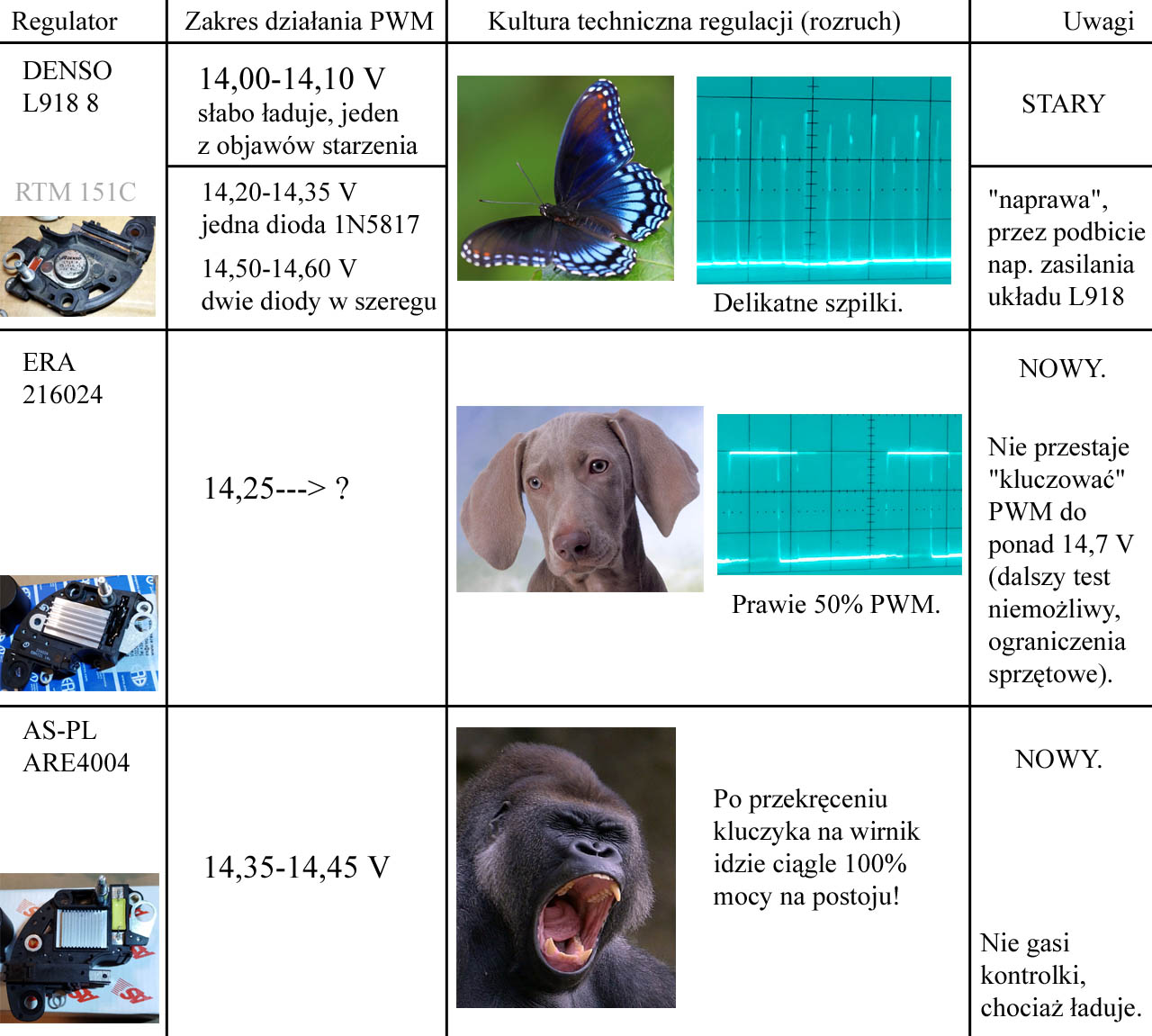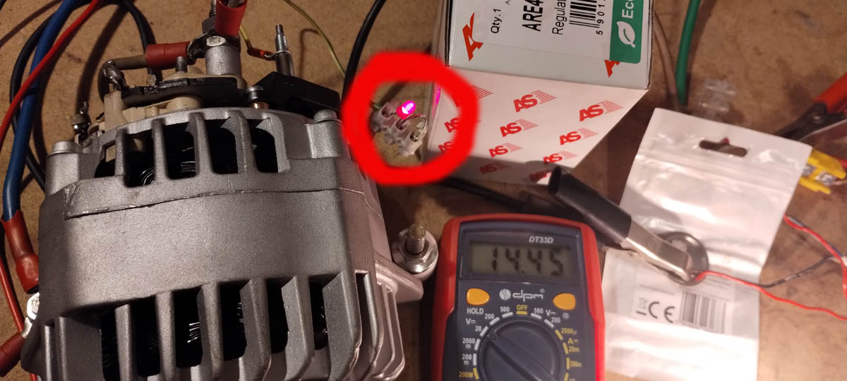 Tani szajs "ARE", jak było wspomniane, smaży wirnik na postoju (100% zasilania) oraz nie gasi kontrolki, ale ładuje niby "książkowo" (oczywiście to bzdura, nie ma "jedynie słusznego" napięcia, bo to zależy od np. klimatu, przeznaczenia samochodu, sposobu użytkowania, ale generalnie fajnie widzieć 14 z przodu, a co po przecinku "to zależy").
