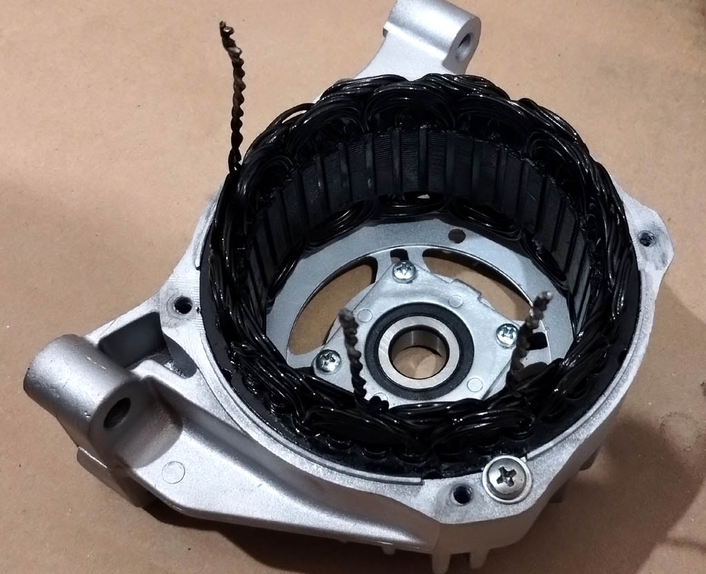 ---------------------------[ Dodano: 17 Wrz 2023, 17:11 ]----------------------------------Dalsze działania. Uzwojenie stojana dało się powoli wybić grzejąc lekko oprawę. Druty trochę obite, ale nie przerwane. Korozja aluminium nie do ukrycia, piaskowanie (średnie/grube ziarno) nie usuwa wszystkiego.