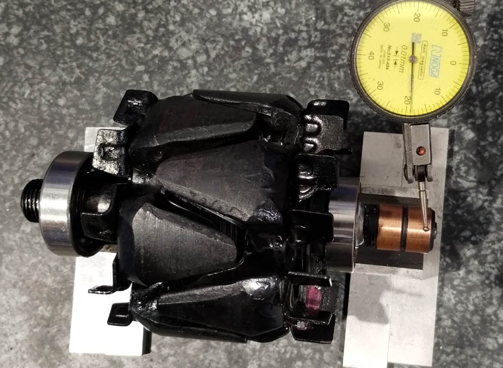 Alternator był cały skorodowany (alu mocniej niż stal) i wymagał drastycznych metod przy demontażu (siłowo, chemią, temperaturą). Ośkę zgiąłem nieco. Nowe pierścienie "biją" (w widoczny sposób, nie trzeba mierzyć). Generalnie, to obie strony wirnika można zgiąć!