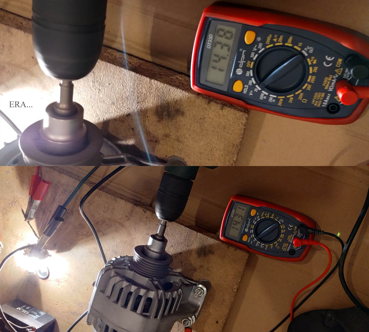 Testy alternatora. W domowych warunkach słabo to wygląda, trzeba by zbudować stanowisko, z napędem, z regulowanym obciążeniem itp., itd. Ale wiertarka też da radę. Obowiązkowo musi być jakiś akumulator oraz obciążenie. Użycie jednej żarówki to proszenie się o kłopoty. Jak się spali to może wziąć ze sobą regulator. W trakcie "testów" modyfikowanego ST-Denso, spaliła się żarówka H4 (albo regulator ją spalił, tego się nie dowiemy - na wszelki wypadek, modyfikacji NIE polecam). Dostał zwarcia na sterowaniu wirnikiem (idzie 100% ciągle). Także uważać. Jak żarówki, to musi być kilka na raz. Połączenia pewne, oczka, nie "na skrętkę", czy krokodylki.