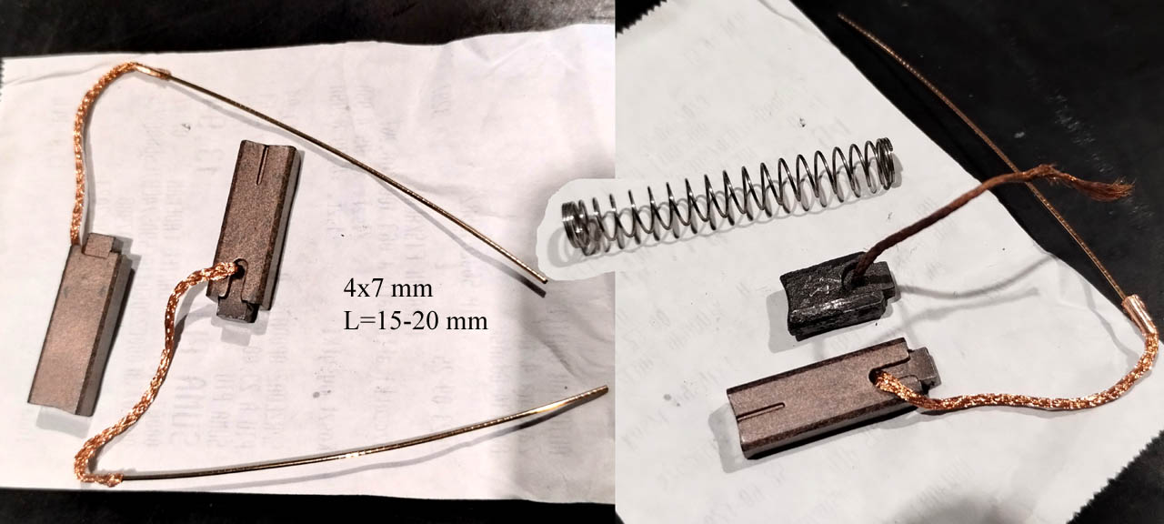 Jak ktoś potrzebuje, to są dostępne same szczotki. Rozmiar 4x7, długość chyba "19,5" mm w ofertach. Wyprowadzenie ma być boczne (jak na fotografii), nie na końcu szczotki. Nie zgubić sprężynek (nie ma w zestawie, tylko szczotki). Druciki/wąsy służą podobno do montażu (w innych alternatorach). U nas nie potrzebne, odłamać od razu.