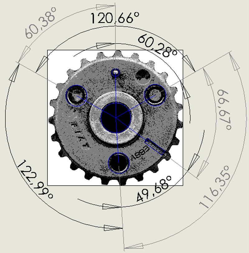 "Pomiary" z fotografii (skan). Można się pomylić o 1 stopień, ale nie 3-4. Wygląda na celowe przestawienie, najprostsze "zabezpieczenie przed kopiowaniem", albo utrudnienie, aby nie mylić kółek między silnikami, modelami (bo z wyglądu mogą być takie same, ale pozycjonowanie koła fonicznego inne, zmienne fazy itd.).