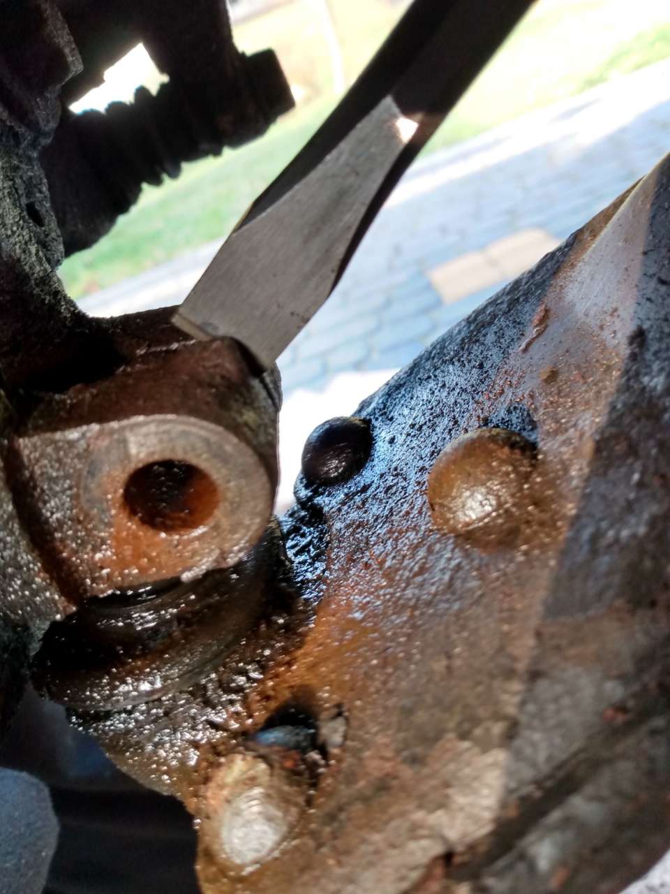 8. Odkręcamy wahacze od zwrotnicy, po jednej stronie chwytamy kluczem płaskim 16, po drugiej odkręcamy. Potem wybijamy śrubę, wbijamy dłuto w środek tej tuli w zwrotnicy (jest miejsce na to), wkładamy breszkę między sworzeń wahacza, a zwrotnicę i próbujemy "zbić" sworzeń.