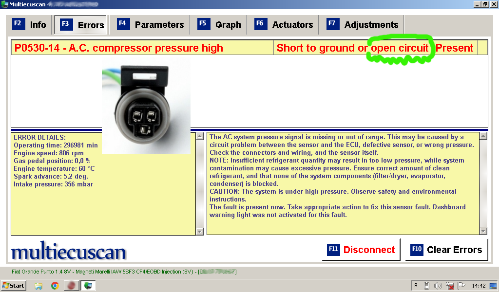 Odłączenie czujnika robi taki błąd (treść błędu głupia, że "ciśnienie wysokie", za to objaśnienie ma sens, zwarcie sygnału lub przerwa). Załącznik: