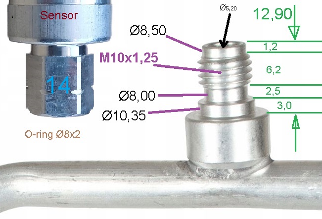 Dla majsterkowiczów obrazek, wymiary złącza (w celu dorobienia adaptera). Liczy się gwint i otworek wewnętrzny (aby zmieścił dzyndzel wystający z wnętrza czujnika) i tyle. Rowek na o-ring można sobie darować i złożyć to np. na klej do gwintów. Załącznik: