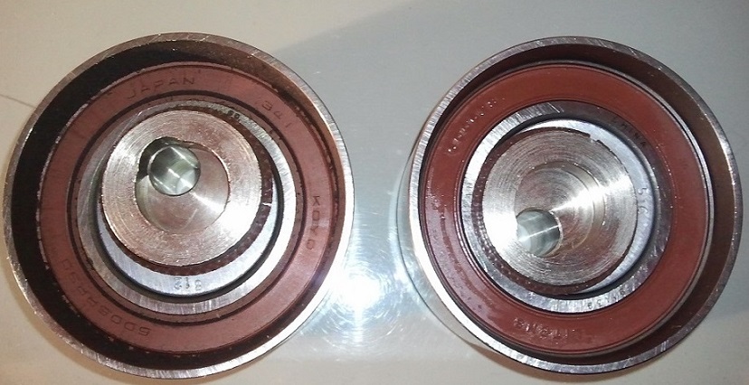 Podobnie rolka napinacza w stanie idealnym, żadnego zbędnego luzu ( jak wiadomo nawet nowa ma minimalny luz, tak samo jak nowe łożyska) kręciła się z lekkim oporem dokładnie tak samo jak nowa. Dlatego zdziwiły mnie wpisy przedmówców w tym temacie jak to zmieniali rozrząd wcześniej niż ja (w młodszych autach) i z mniejszym przebiegiem i u niektórych rozrząd był w stanie b. złym tzw. ostatni moment. Tylko czy mieliście te auta od nowości, że jesteście 100% pewni przebiegu? Bo jak auta sprowadzane, kupione z komisu albo od handlarza to wszystko jasne, przebieg x2 x3 najczęściej z tym co na liczniku. Ja myślę, że na tym fabrycznym zestawie bym przejeździł spokojnie jeszcze 3-4 lata albo do tych 120 tyś km. Gdyby nie.... pompa wody ale o tym później. Jak się okazało fabryczna rolka napinacza zamontowana to był Litens. Co też ważne Litens na łożysku KOYO Japan. To generalnie najwyższa półka jeśli chodzi o łożyska. Pewnie są inne firmy równie dobre jak koyo, ale nie ma lepszych. Po lewej Litens z pierwszego montażu, po prawej napinacz z zestawu rozrządu firmy skf który zakupiłem, ale jednak finalnie założyłem oryginał z ASO. Napinacze praktycznie identyczne ale... W zestawie skf też był Litens (made in canada) ale na bieżni łożyska CHINA. Może w praktyce byłyby 100% identycznej jakości, jednak wolałem nie ryzykować. Załącznik: