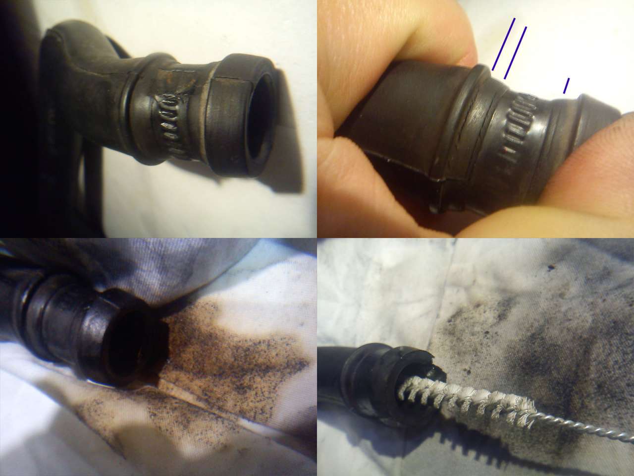 Syf w wężyku (lekki przypadek, są gorsze). Kawałki gumy oczywiście lecą do silnika... Po drugie uważać z opaskami, bo niszczą węże, miażdżą je. Pod opaskę należy coś podłożyć, kawałek grubszego wężyka, pasek gumy np. z dętki rowerowej, aby opaska nie "gryzła" węża. Załącznik: