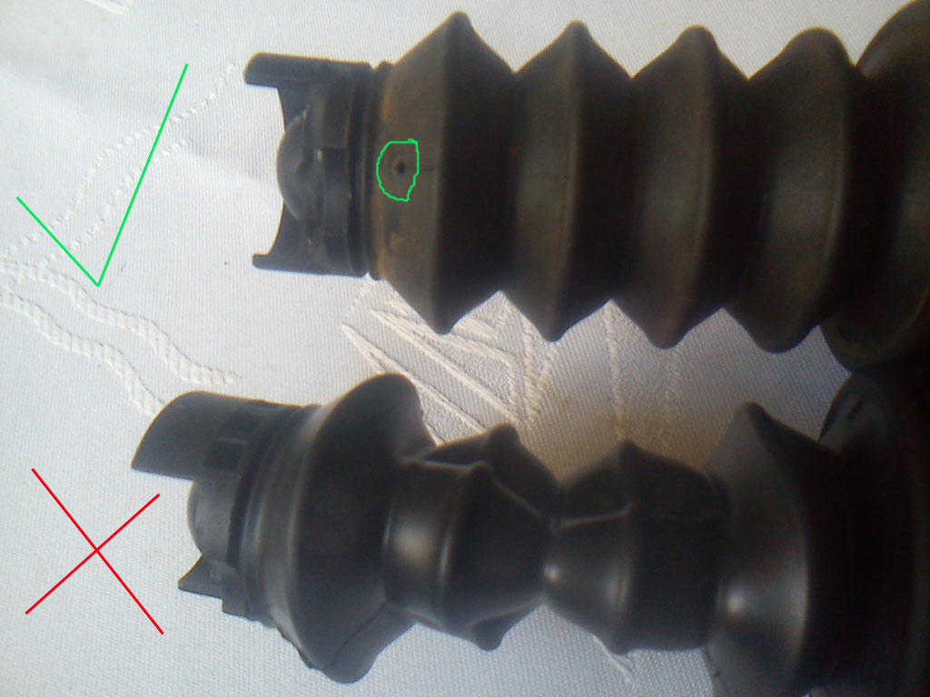 Z drobnych różnic taki szczegół. Nowy wysprzęglik ma szczelną osłonę, mieszek bez otworka. To nie powinno niczego spowodować, ale nie ładnie tak (wypada zrobić własny "odpowietrznik" aby nie ssało uszczelniacza). "Zaoszczędzili" głąby na jednej "operacji technologicznej", zlikwidowali otwór w gumie. Śmiechu warte.