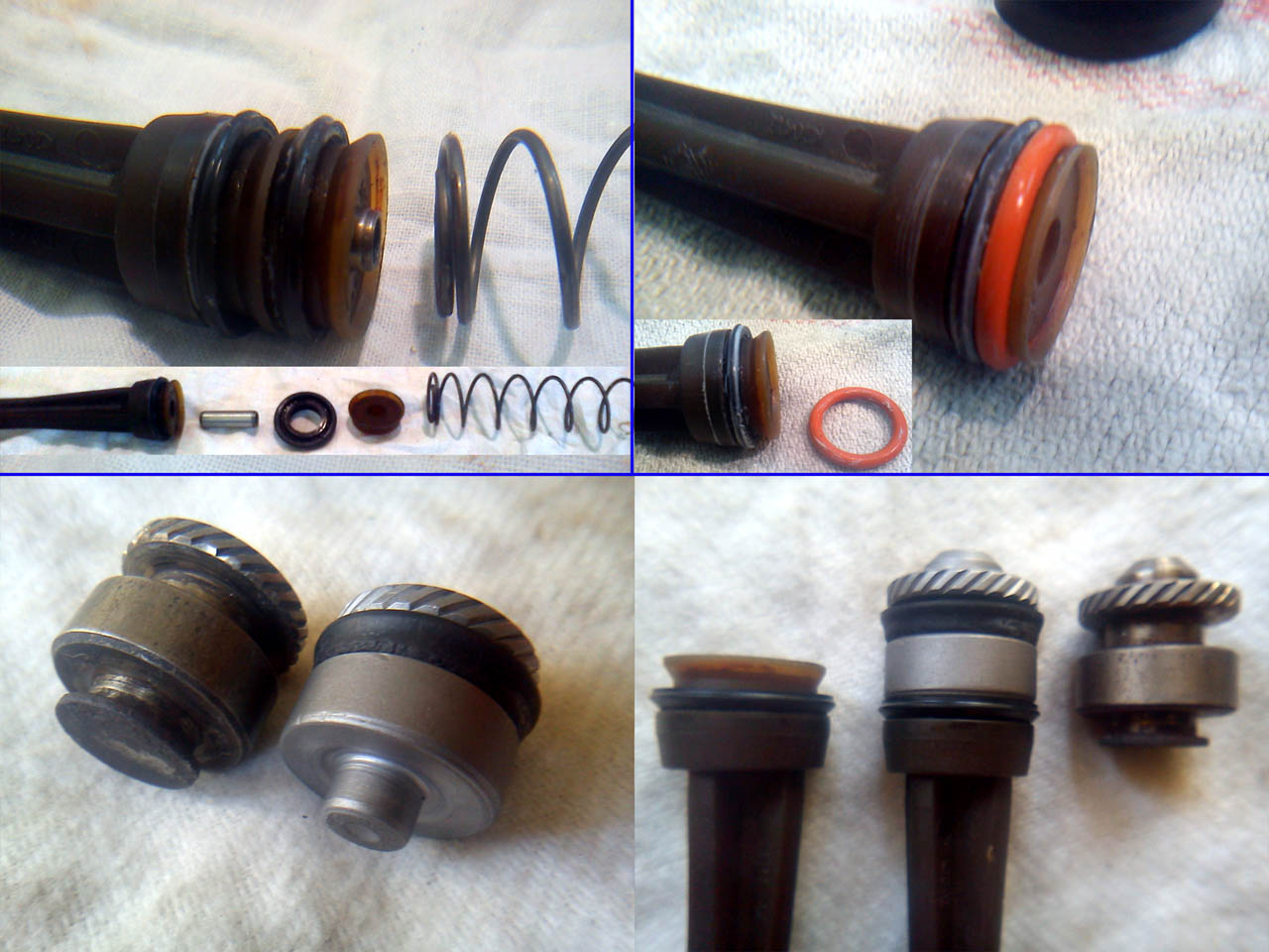 Dlatego już planowałem modyfikacje, propozycje na obrazku (jeszcze żadna nie sprawdzona w praktyce): złożenie 2 uszczelniaczy na stos, dołożenie o-ringa (najprostsze rozwiązanie i chyba byłoby najlepsze), dodanie tłoczka z cylinderka hamulcowego (akurat średnica identyczna), ale to zmniejsza objętość siłownika (a stąd mogą być problemy - np. zmiana skoku roboczego?).