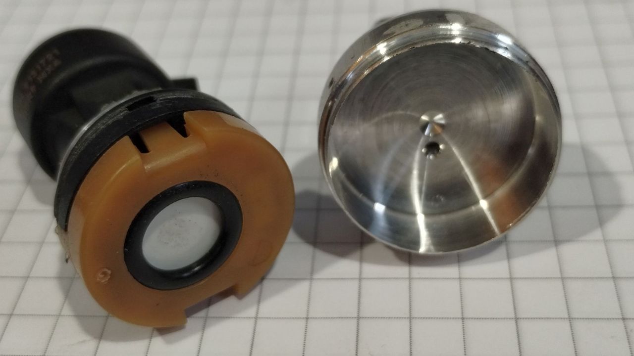 Dodatkowy tłoczek z tworzywa. Z uszczelniaczem (starym) ze starych tłoczków z Punto 1, średnica ta sama 20,6(4) mm, system "Lockheed", możliwe, że wersja na o-ring też by działała równie dobrze. Średnice traktować jako maksymalne, lepiej wykonać wszystkie "w minusie" kilka setek, czy "dychę". Długość końcówki nie może być za krótka. To ma naciskać szpicem (może być nieco ostrzejszy kąt, poniżej 90 stopni stożek) w środek oryginalnego tłoczka/popychacza (a nie zgniatać jego uszczelniacz talerzem) i dlatego dać mu możliwość przechylania się na boki (a wtedy dodatkowy tłoczek się nie przekrzywia i nie popuści płynu). Bardziej fachowo, to by wypadało zrobić kulki (promienie wewn./zewn.) na styku elementów.