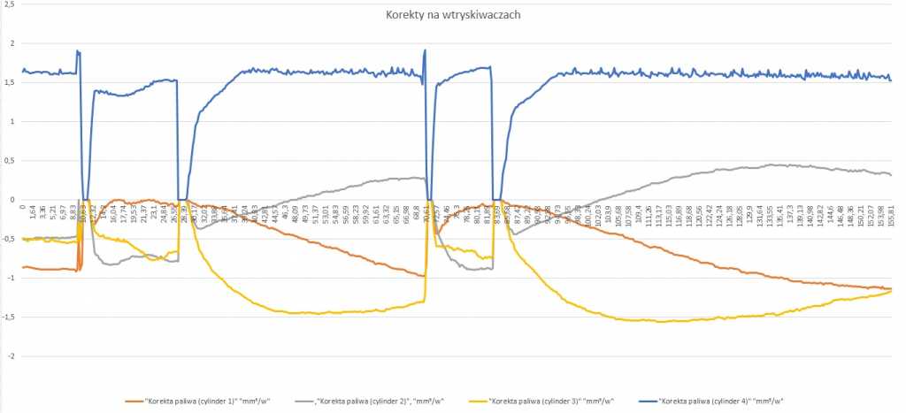Pytanie do osob siedzacych w temacie. Zamieszczam wyres korekt jakie mam na wtryskach. Zaczyna sie od pracy na wolnych obrotach, a pozniej sa dwie male przegazowki do 2000rpm przytrzymane na tych obrotach przez kilkanascie sekund.