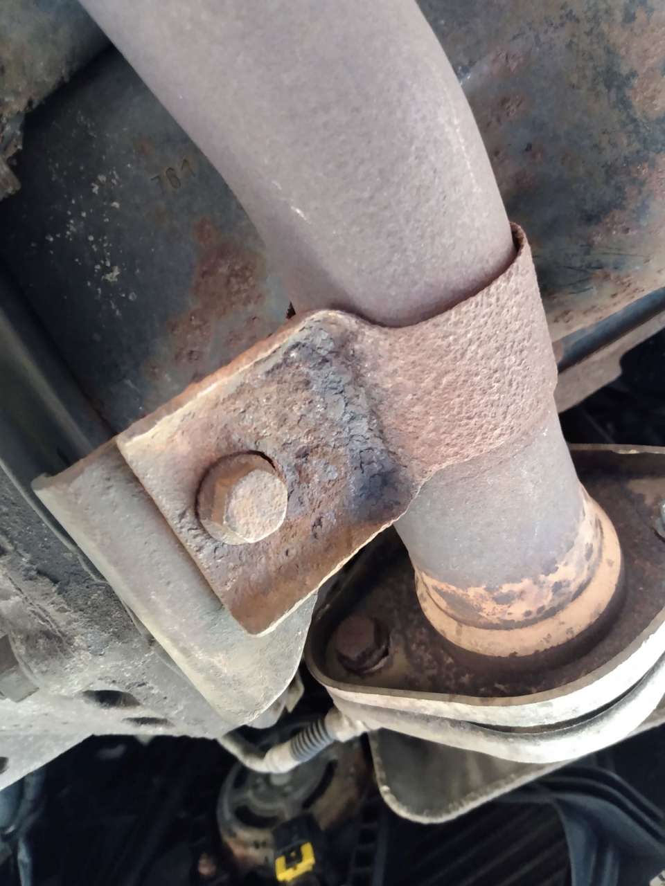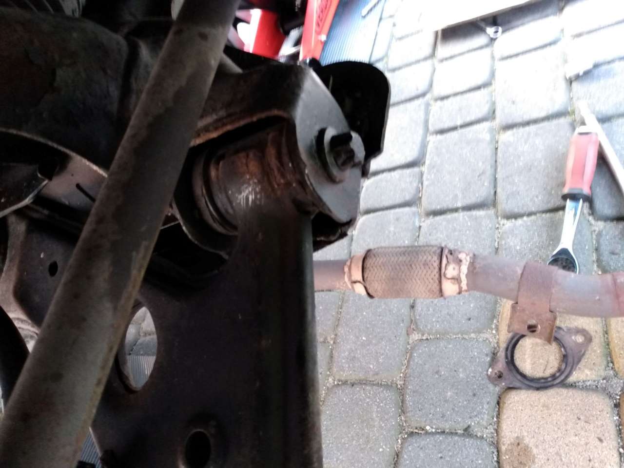 5. Opuszczamy wydech. Można też próbować odczepić z tyłu przy tłumiku, ale nie przeszkadza jakoś bardzo, tak że może po prostu "leżeć" na ziemi przednia część, a tył normalnie trzymać się przymocowanego tłumika - przynajmniej u mnie to się udało, możliwe że jak jest mocno skorodowany to może się zerwać. Jak działacie w kanale, to trzeba jakoś podeprzeć, albo jednak ściągnąć.