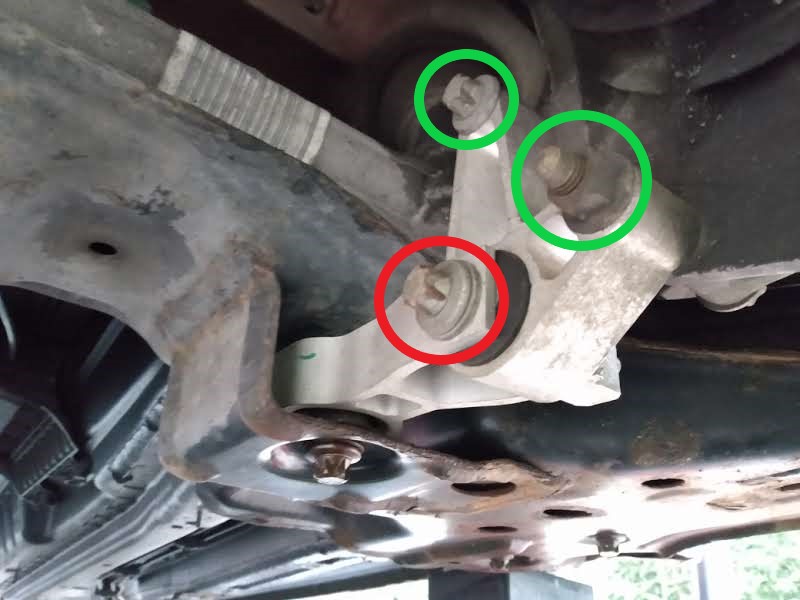 12. Odkręcamy poduszkę skrzyni biegów ("lizak") - od wózka i od drugiej części poduszki, która przykręcona jest do skrzyni. Mi nie udało się odkręcić poduszki od drugiej części (zaznaczone na czerwono), tak że odkręciłem po prostu tą drugą część od skrzyni (zaznaczone na zielono) (ale to już po zdjęciu wózka - można zdjąć odkręcając tylko od wózka - założyć też pewnie się da, ale wygodniej odkręcić poduszkę).
