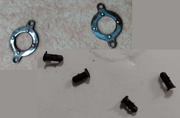 16. Od góry wózka mamy takie podkładki, mocowane kołeczkami. Teoretycznie powinny być 4 podkładki, u mnie w starym byłe dwie (na skrajnych otworach, w środku nie było). Nie wiem czy one w ogóle coś dają, ale ja przełożyłem ze starego. Delikatnie podważamy np. płaskim śrubokrętem i wyciągamy (uważamy, aby nie uszkodzić kołków). Podkładki zalałem na jakiś czas odrdzewiaczem, a potem zeskrobałem trochę rdzę. Montujemy do nowego wózka przy pomocy kołków.