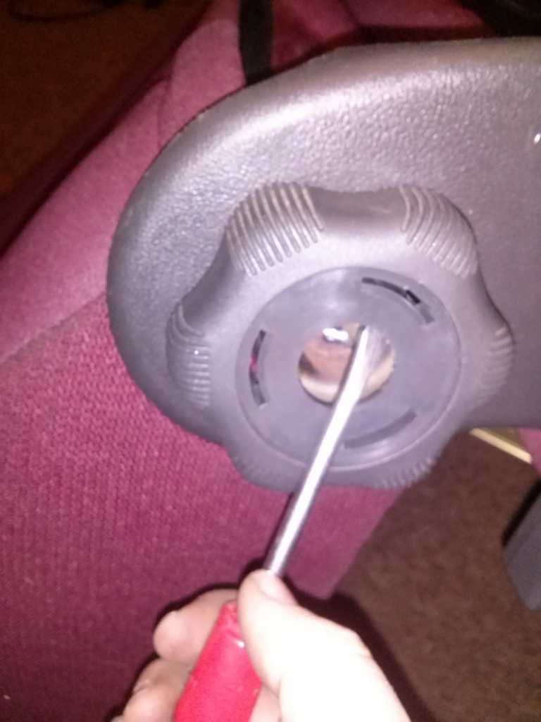 3. Zaczynamy od tego, że odkręcamy i zdejmujemy plastiki, które są w dolnej części fotela, z pokrętła zdejmujemy zaślepkę delikatnie ją podważając płaskim śrubokrętem, a samo pokrętło również delikatnie podważamy z każdej strony