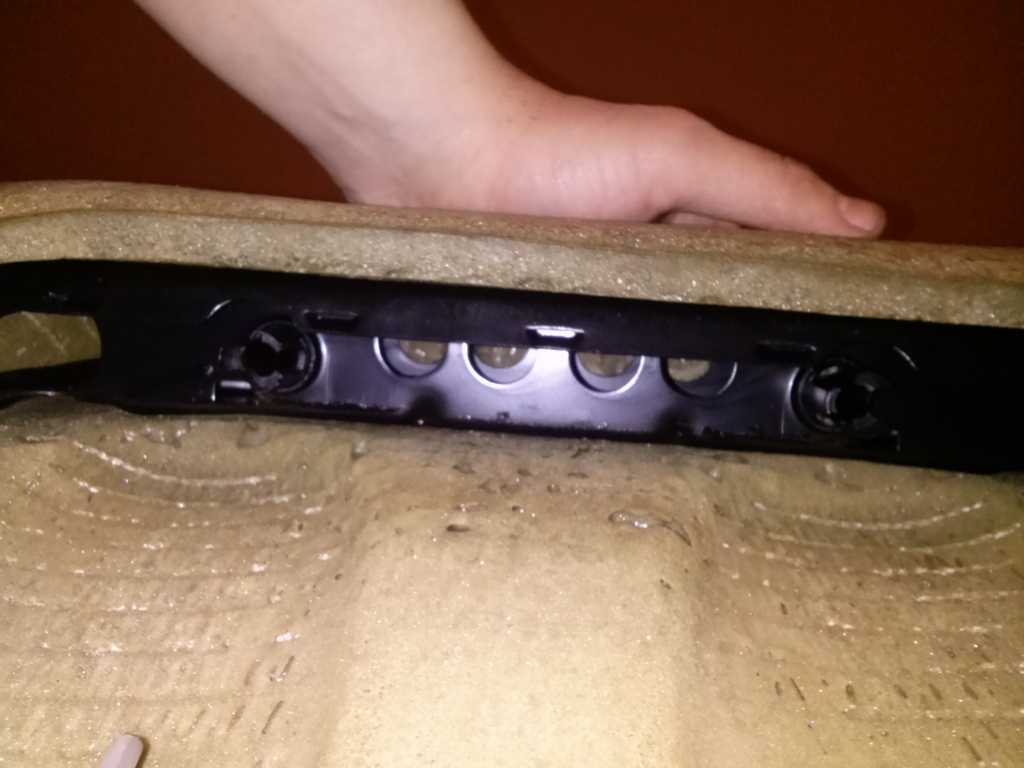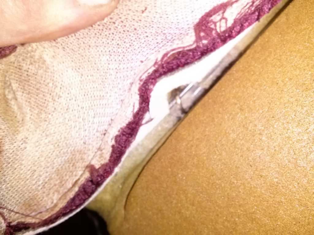9. Materiał siedziska trzyma się poprzez małe ząbki w szynie, jak i samą szyne, która leci dookoła od spodu. Wsadzamy płaski śrubokręt i co jakiś czas "przekręcamy" go w tej szynie, żeby nam się lekko rozszerzyła (najlepiej zaraz obok ząbków)