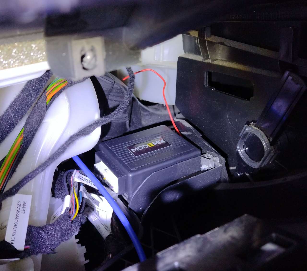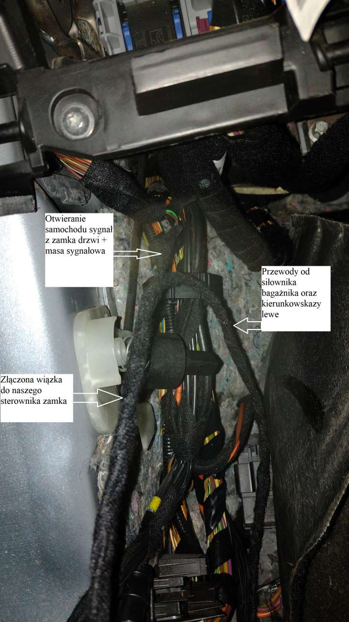 Następnie należy znaleźć ten przewód we wiązce wychodzącej z drzwi. Dostęp jest dość utrudniony ale da się zrobić. Dodatkowo znalazłem również przewód masy sygnałowej, i jego też podłączyłem co zalecam. Tą masę stosujemy tylko do sterowania! Zawsze warto oddzielać masy sygnałowe od zasilających aby uniknąć potencjalnych zakłóceń.