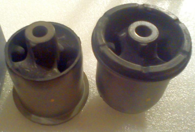 Objawy zmęczonych tulei: auto "pływa" na boki mimo nowych amortyzatorów (nawet wszystkich 4), "tył goni przód" po ostrym skręcie. Po wymianie na nowe auto wraca natychmiast na tor jazdy, ugięcie nadwozia po ostrym ruchu kierownicą jest jedno i spokój (a na starych gumach są 2-3-4 oscylacje). Z przodu jest to samo (duża tuleja wahacza, też się rwie, pęka jak tutaj i też to słabo widać jak wszystko jest brudne).