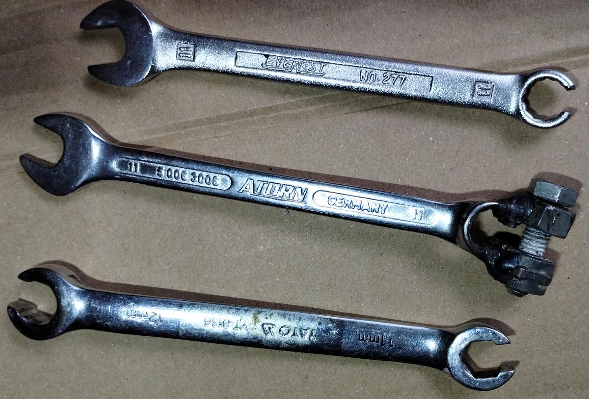 Z narzędzi trzeba mieć otwarte oczko sześciokątne (oczywiste), ale samoróbka 12-kątna też jest potrzebna, pomaga kręcić dalej już poluzowaną nakrętką, bo może być mało miejsca. Jak ktoś nie ma 6-kąta, to można przerobić 12-kąta, dospawać jak na obrazku "ścisk" do oczka (ze śruby M8), wtedy nie przeskakuje, nie obrobi nakrętki (testowane, działa). Czyli z obrazka najlepiej mieć wszystkie te 3 rodzaje!