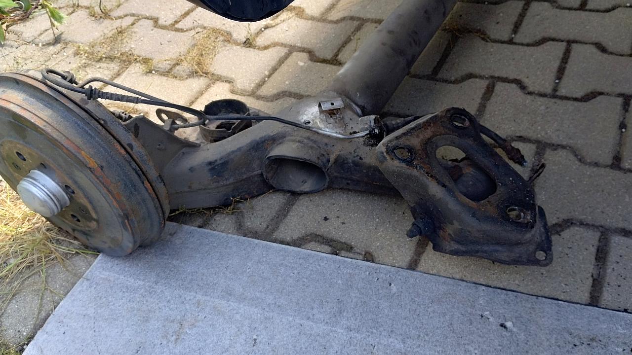 Najtrudniejsza część operacji u mnie: korozja i zapieczone przewody hamulcowe! Musiałem przygrzać palnikiem (stosujemy improwizowaną osłonę, z kawałka blachy itp., aby nie podpalić czegoś, ani nie stopić). Bez uwolnienia przewodów/wężyków robota leży (nie zrobisz tej belki dzisiaj).