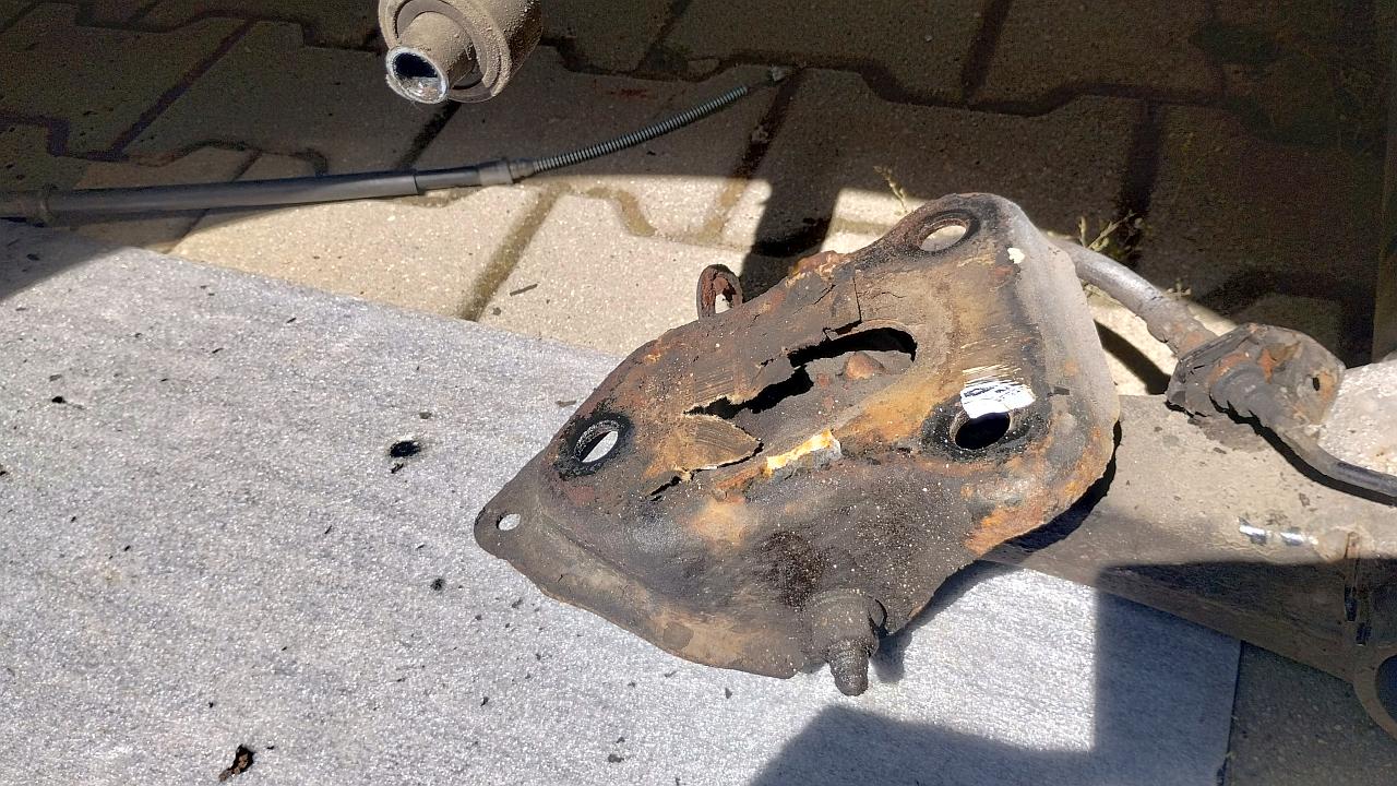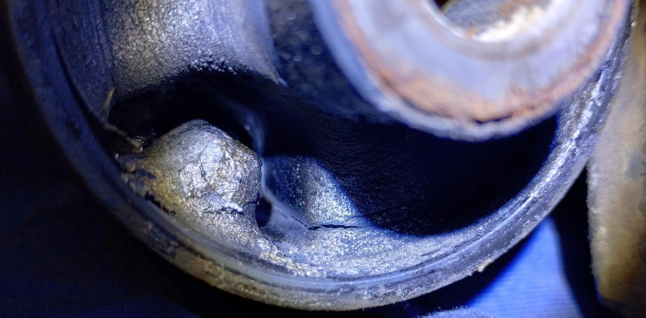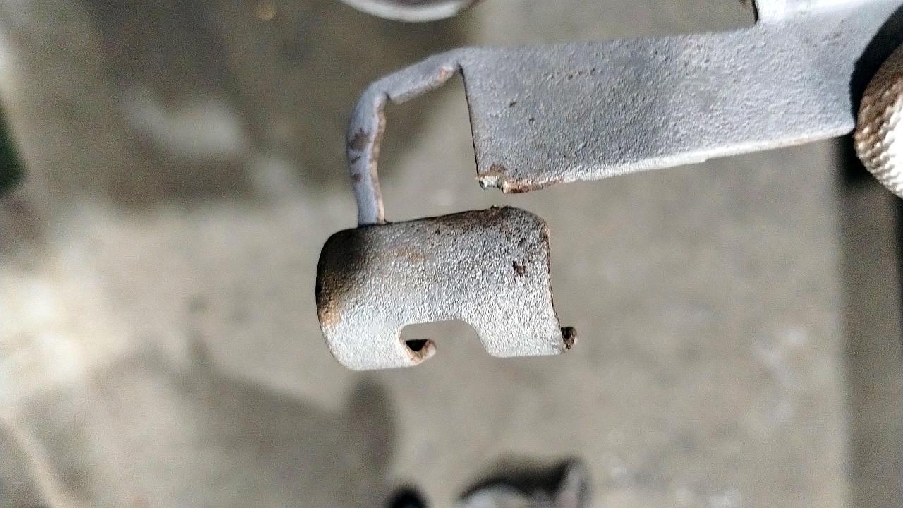 Wstępne piaskowanie starych mocowań. Widać jak tuleja pracuje i wyciera kołnierzem mocowanie. Trochę bez sensu projekt (po co to ma trzeć o metal?). A może ociera dopiero jak jest coś zużyte(?).