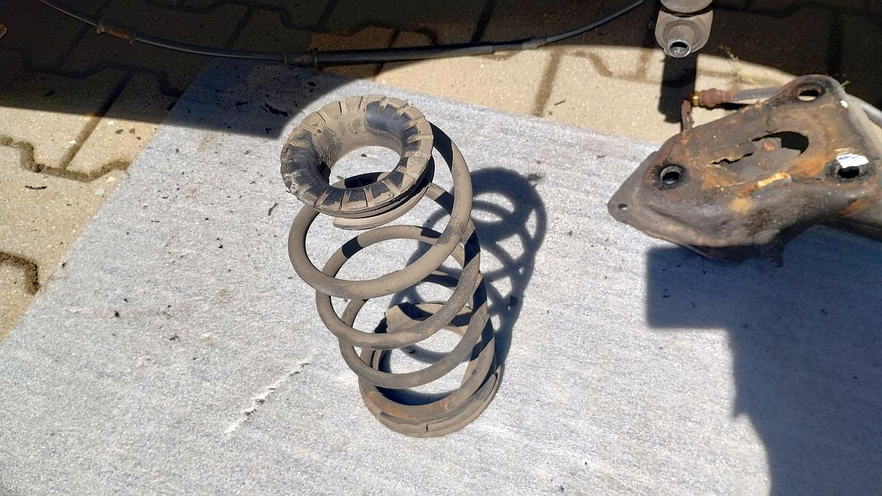 Oceniamy stan sprężyn (porównujemy wysokość L/R) i gum (dół, góra). Odpryski farby zamalować. Jak głębokie wżery, to sprężynę lepiej wymienić. Gumy mimo, że są całe, mogą być wymęczone, spłaszczone (co zobaczysz na 100% dopiero przez porównanie z nowymi). Zamówione gumy nie dotarły, będę składać na starych...