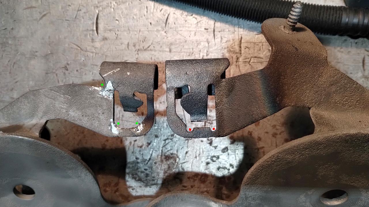 Na szybko można przyłapać spawarką oraz wzmocnić nieco (zaspawać te głupie wcięcia, osłabiają element - czerwonymi kropkami zaznaczone). Przy okazji uwaga, że przy de/montażu linek wyginamy tylko ten środkowy listek, nie gniemy dwóch "palców". Tak się łamie całość mocowania (jak gnije, to się w rękach łamie niestety, nawet jak wiesz i uważasz).